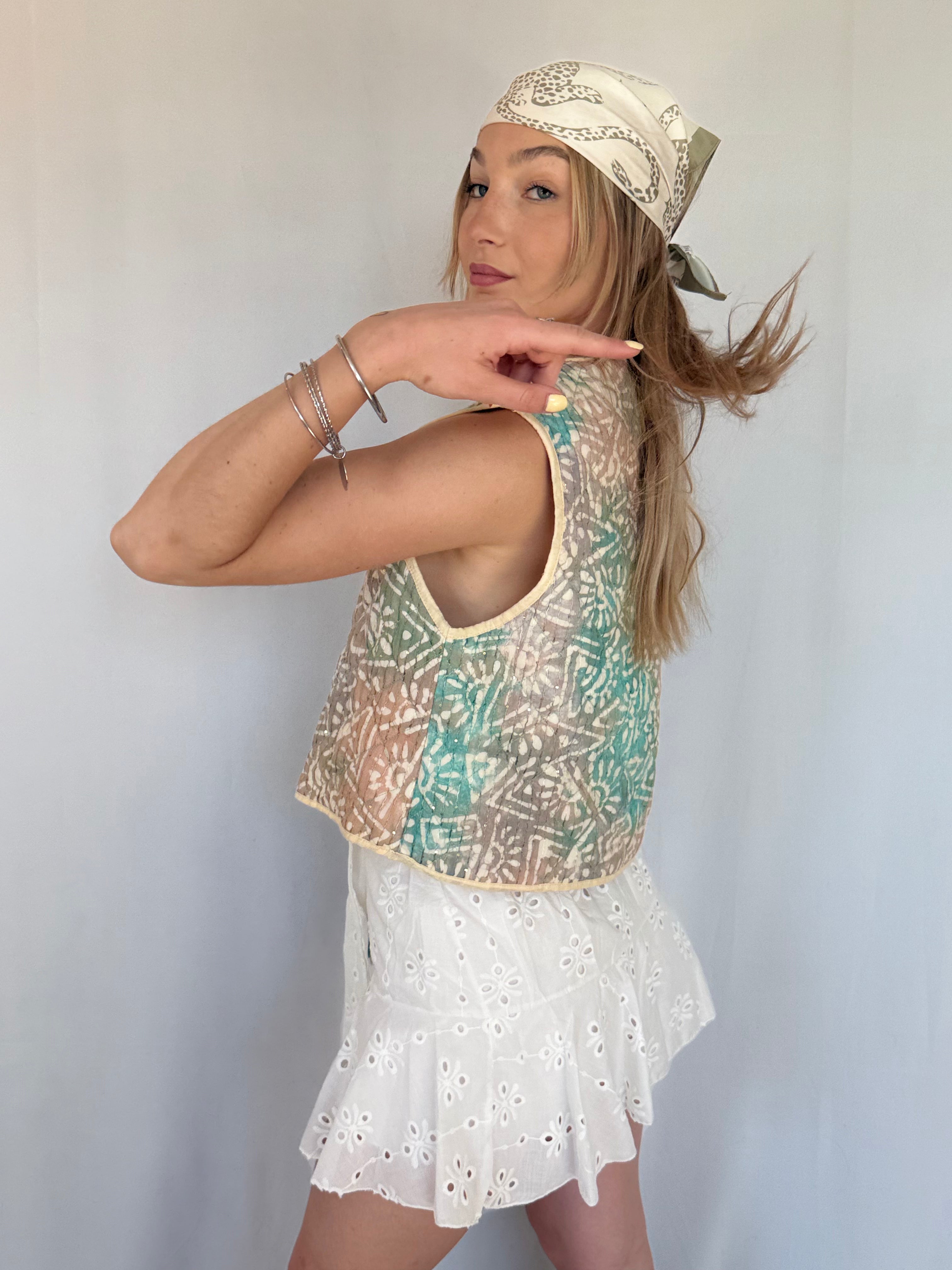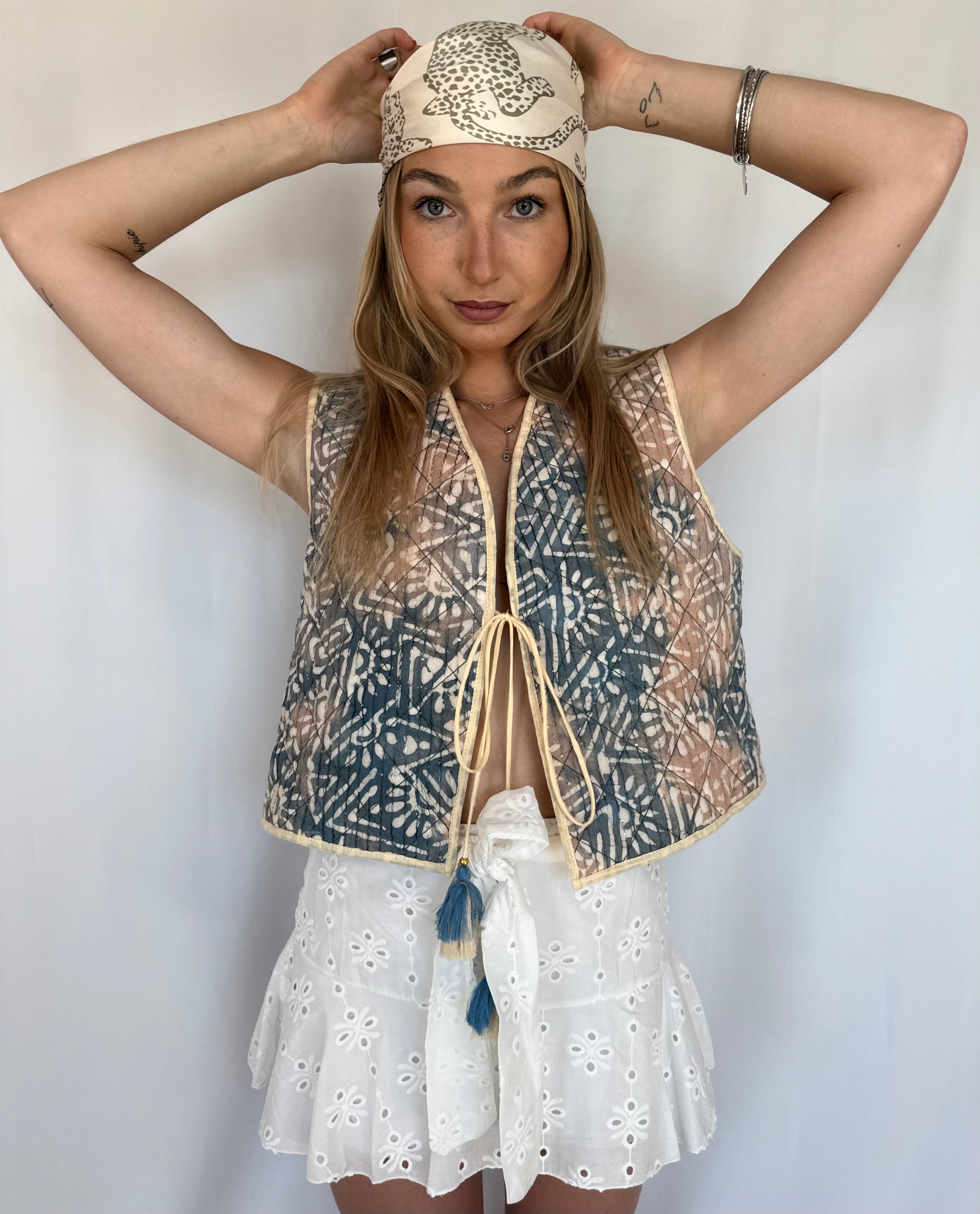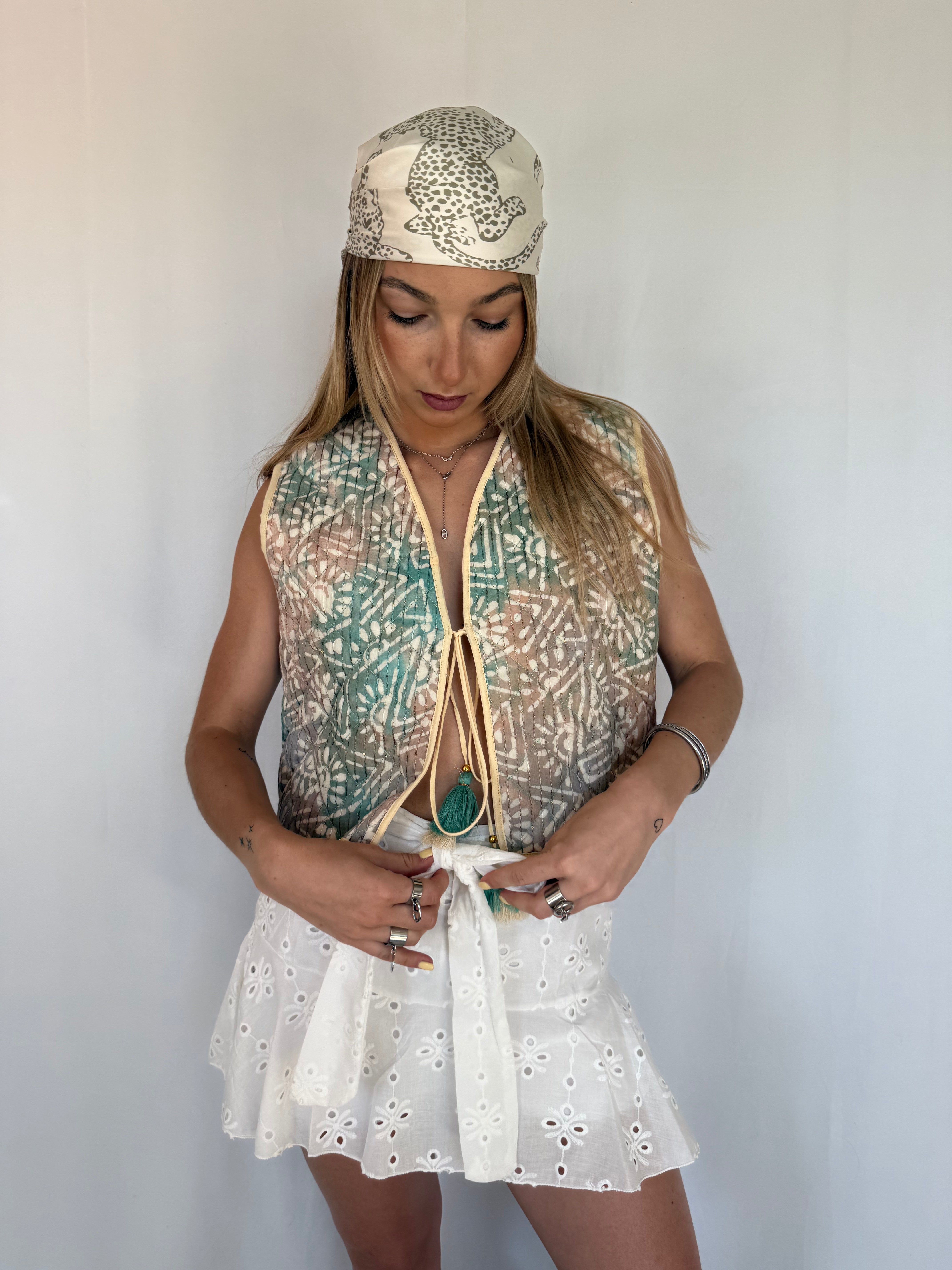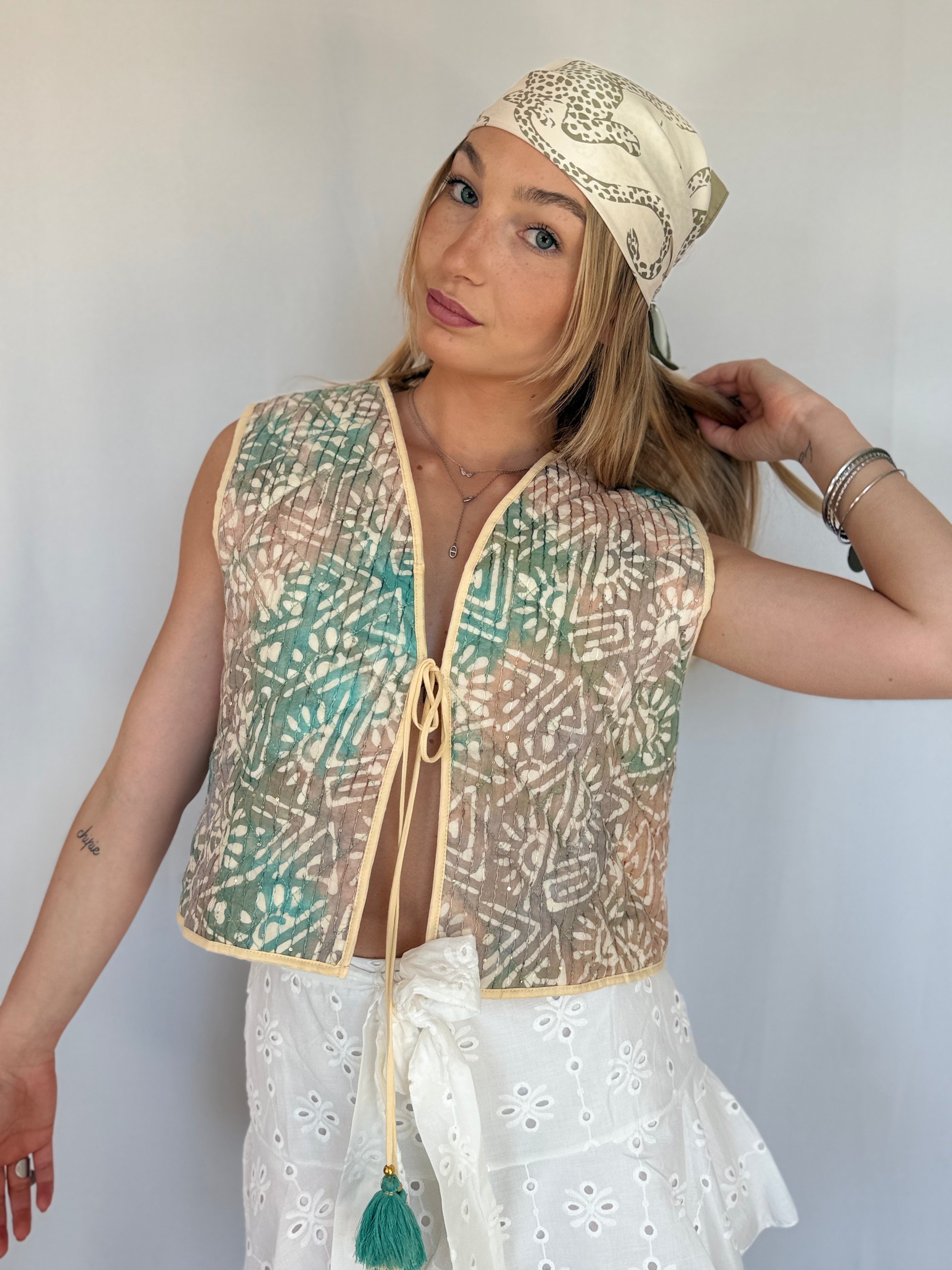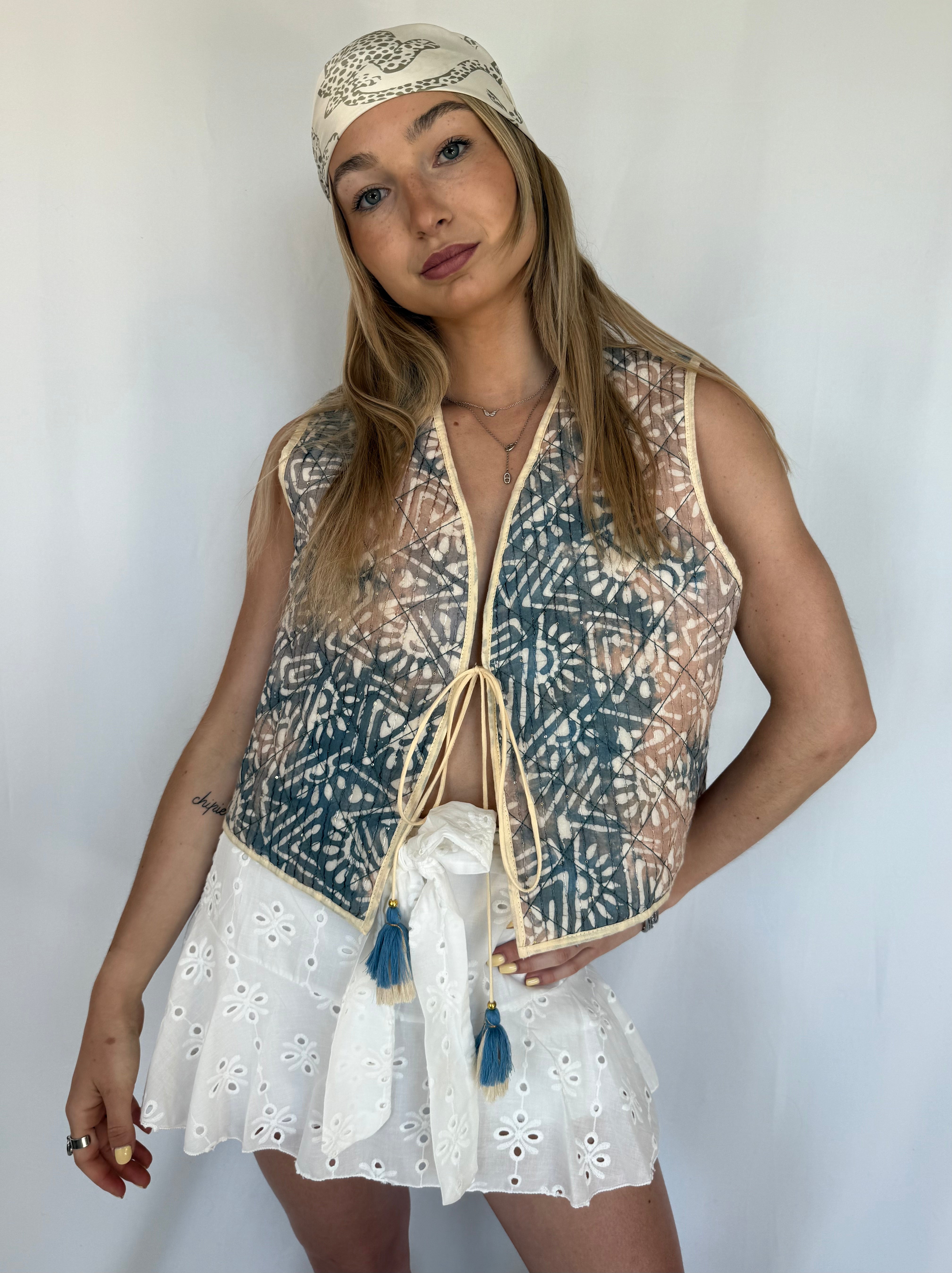 Le gilet sans manche MIMI est l'accessoire parfait pour compléter votre tenue. Avec son design élégant et ses détails paillettes, il apporte une touche de glamour à n'importe quelle occasion. Fabriqué en 100% coton, il est également confortable et facile à porter. La fermeture en lacet avec un pompon ajoute une touche de fantaisie à ce gilet sans manche.
